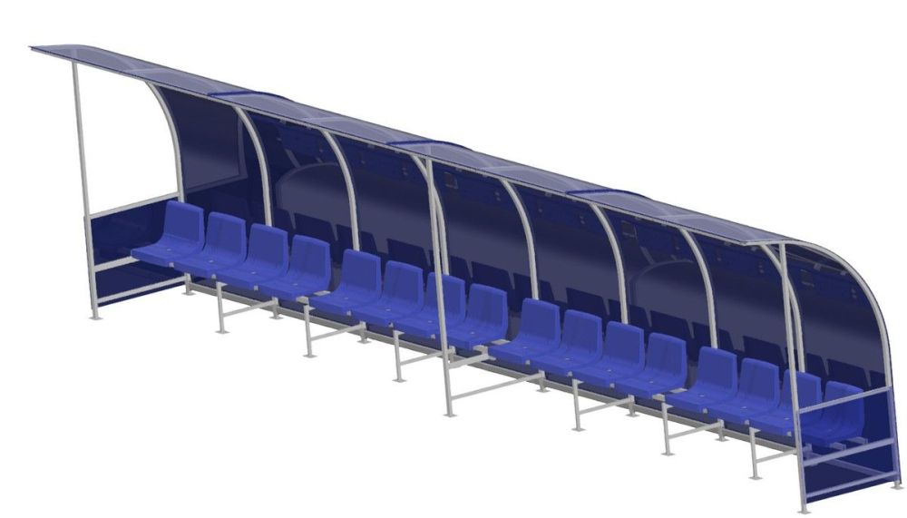 Скамейка состоит из металлического каркаса и поликарбонатных защитных вставок, подходит для размещения 16 игроков.