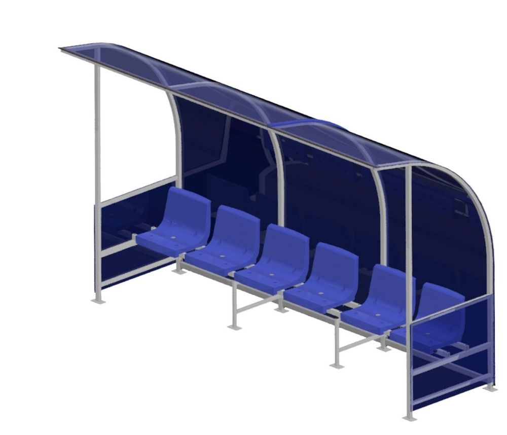 Скамейка состоит из металлического каркаса и поликарбонатных защитных вставок, подходит для размещения 6 игроков.