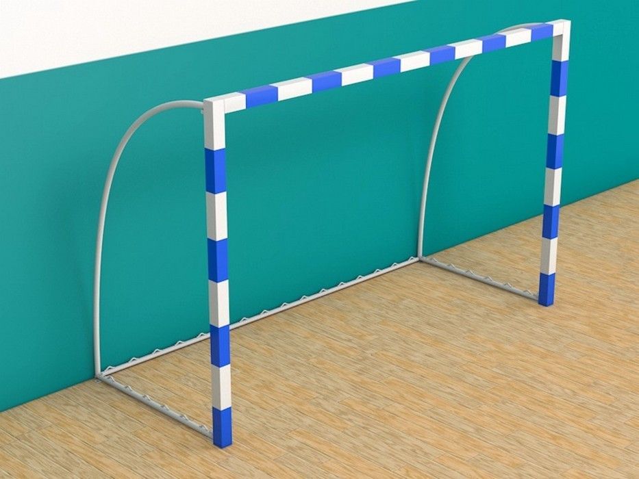 Рама ворот выполнена из профильной трубы 80х80 мм. Ворота стационарные, крепятся к полу с помощью закладных деталей, которые поставляются с воротам в комплекте. Складываются только в одну сторону. Могут быть сняты с места установки, разобраны и убраны в место хранения. Складная конструкция очень удобна тем, что ворота вне эксплуатации не занимают много места. Данная конструкция особенно актуально в маленьких спортивных залах.