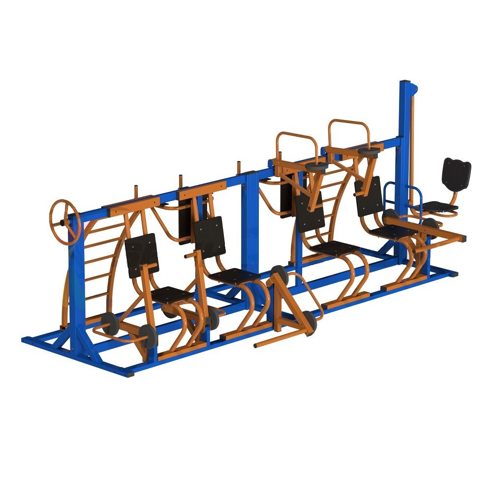 Комплекс включает в себя следующие тренажеры, установленные на единой раме: